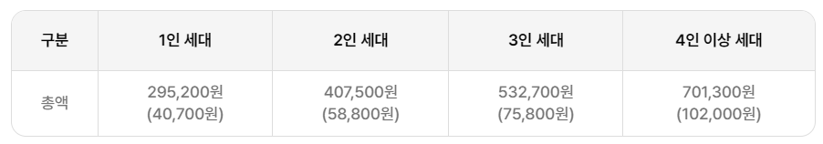 주민등록등본 상 세대원 수에 따라 최소 295,200원부터 최대 701,300원까지 에너지바우처를 지원받을 수 있습니다.