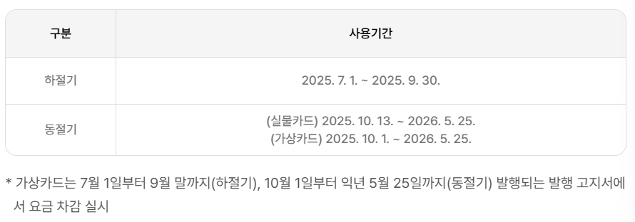 2025년부터는 지원금액을 여름/겨울 구분없이 사용기간 내 자유롭게 사용 가능합니다. 여름에 바우처를 사용하지 않고 겨울 난방비로 몰아서 사용하고 싶으시다면 하절기 요금 미차감 신청이 필수입니다!