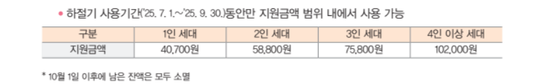 에너지 취약계층을 위해 여름(7월~9월)에는 전기 요금 차감을, 겨울(10월~다음해 5월)에는 전기, 도시가스, 지역난방, 등유, 연탄, LPG 중 한 가지를 선택하여 구입할 수 있는 이용권을 세대원수에 따라 지급하는 서비스입니다.